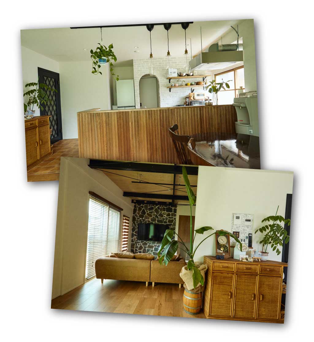 ヴィンテージ感たっぷりの素材感溢れるLDKは
