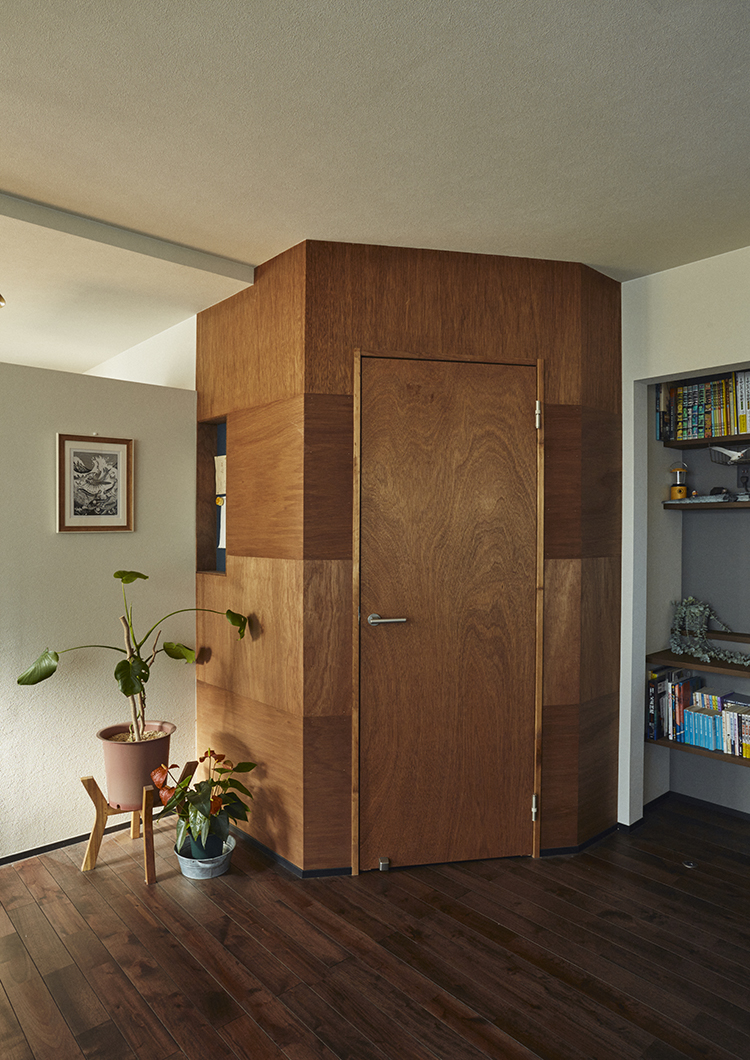 浴室・洗面脱衣ともに元より大きくしているため、LDK内にあまり干渉させないよう角を斜めにしています。
