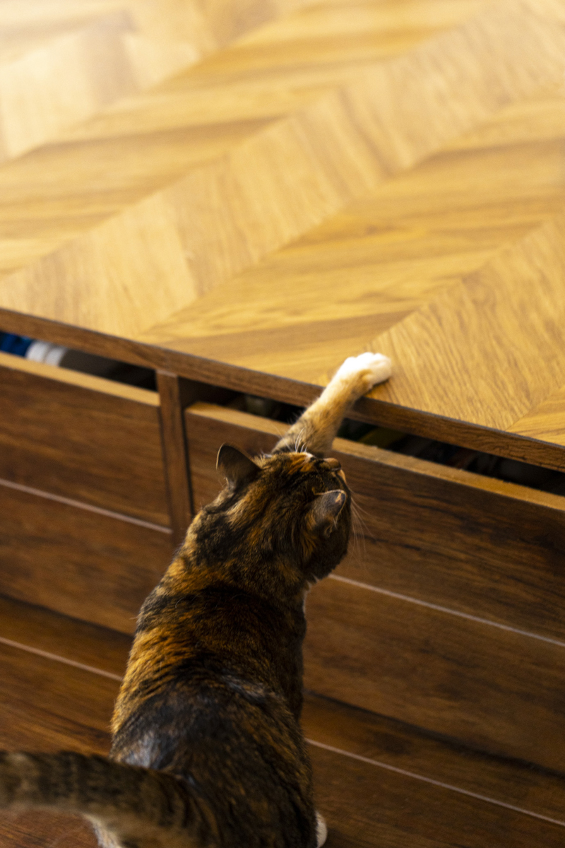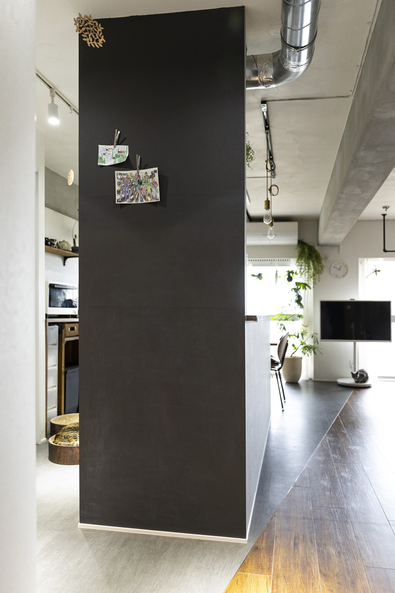 子どもが成長するにつれて少し手狭に感じている時、マンション内で広い部屋が空いたタイミングでリノベーションを決意したお施主さま。キッチンからみんなを見守る、お子さまとねこちゃんが安心してのびのび暮らせる温かいお家が完成しました。