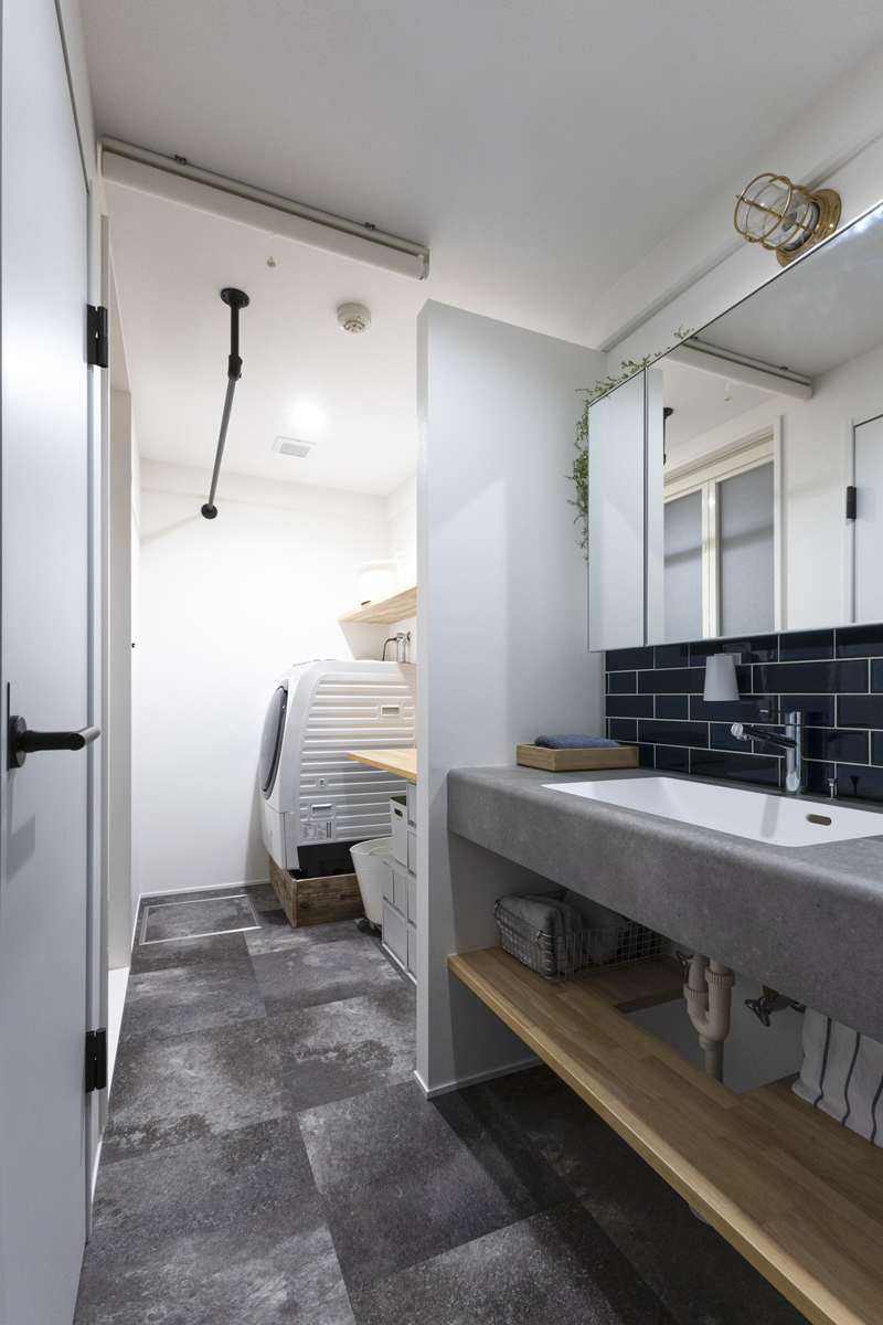 モルタル調のデザインとタイルの藍色がカッコよさを引き立てます。