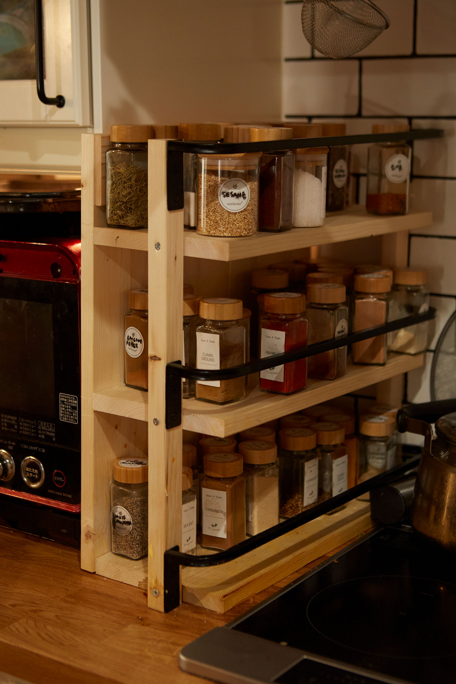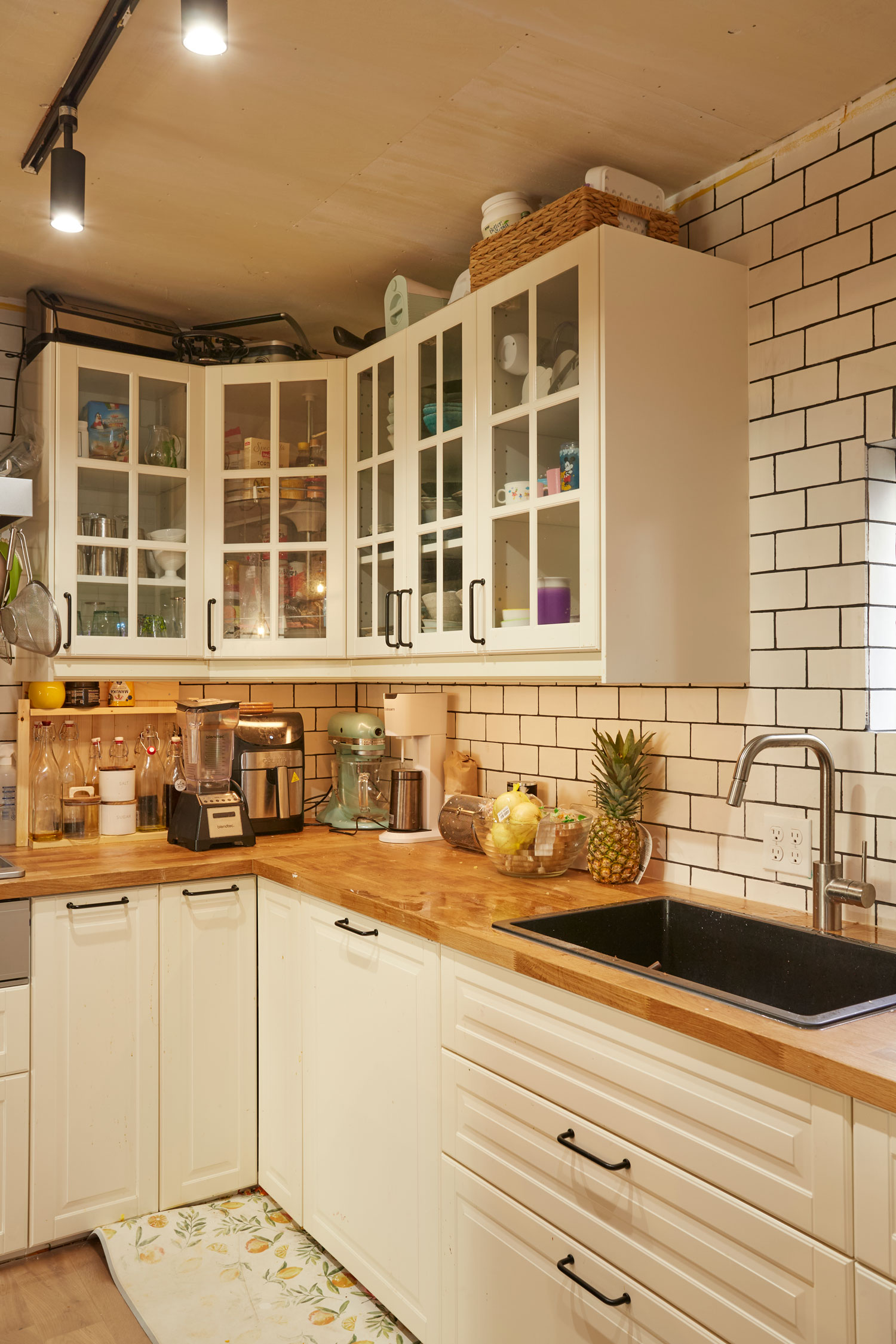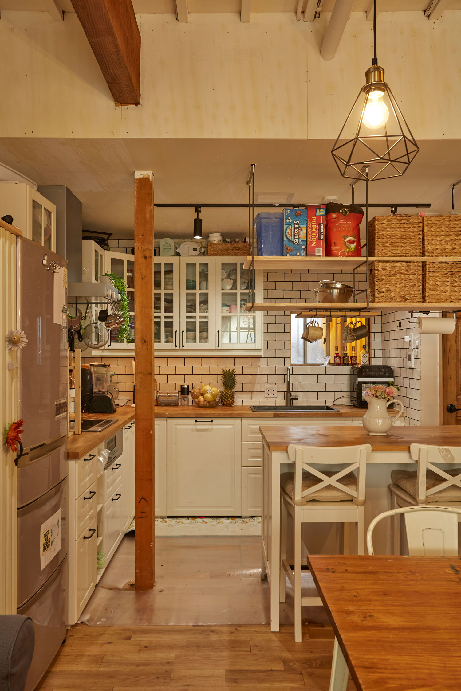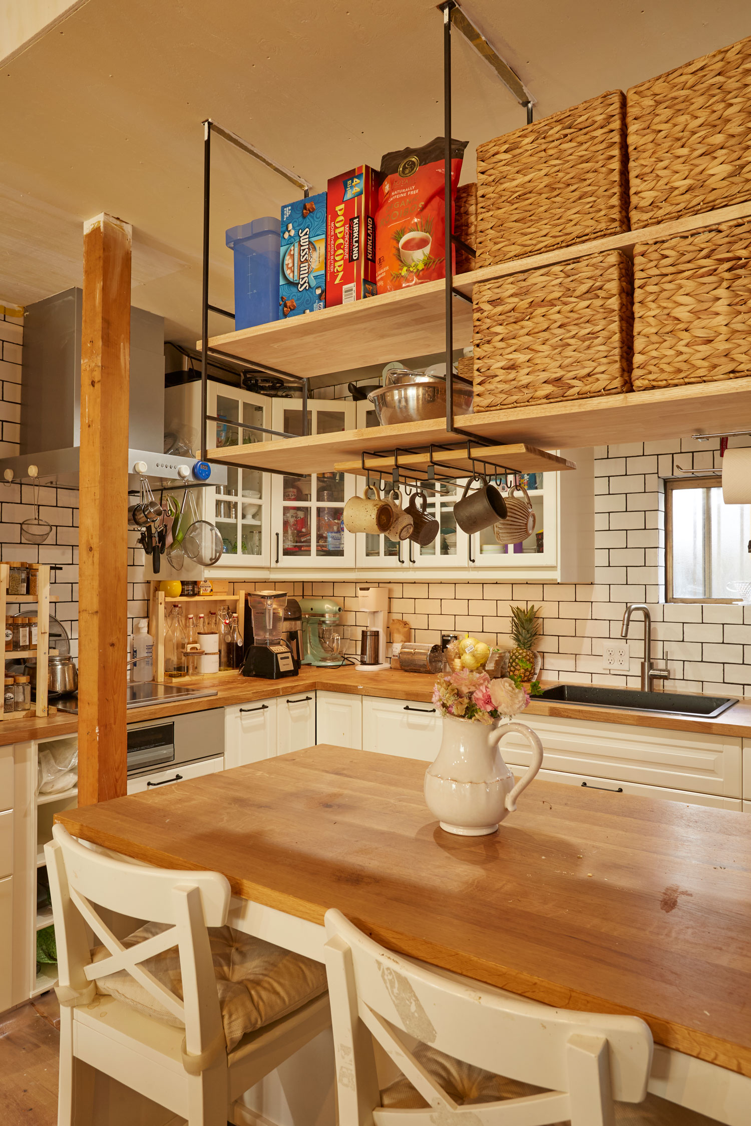 海外製のキッチンがご希望で、IKEAのキッチンをご提案。お持ちのカウンターに合わせて上部に吊り棚を設置しています。