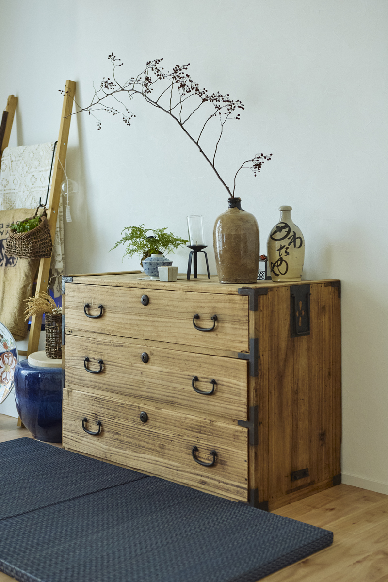 天井の黒と杉のルーバーがスパイスになり、ひとつひとつの小物が映える空間に仕上がりました。