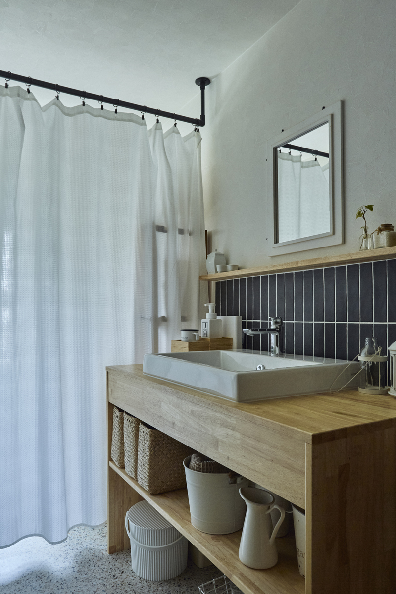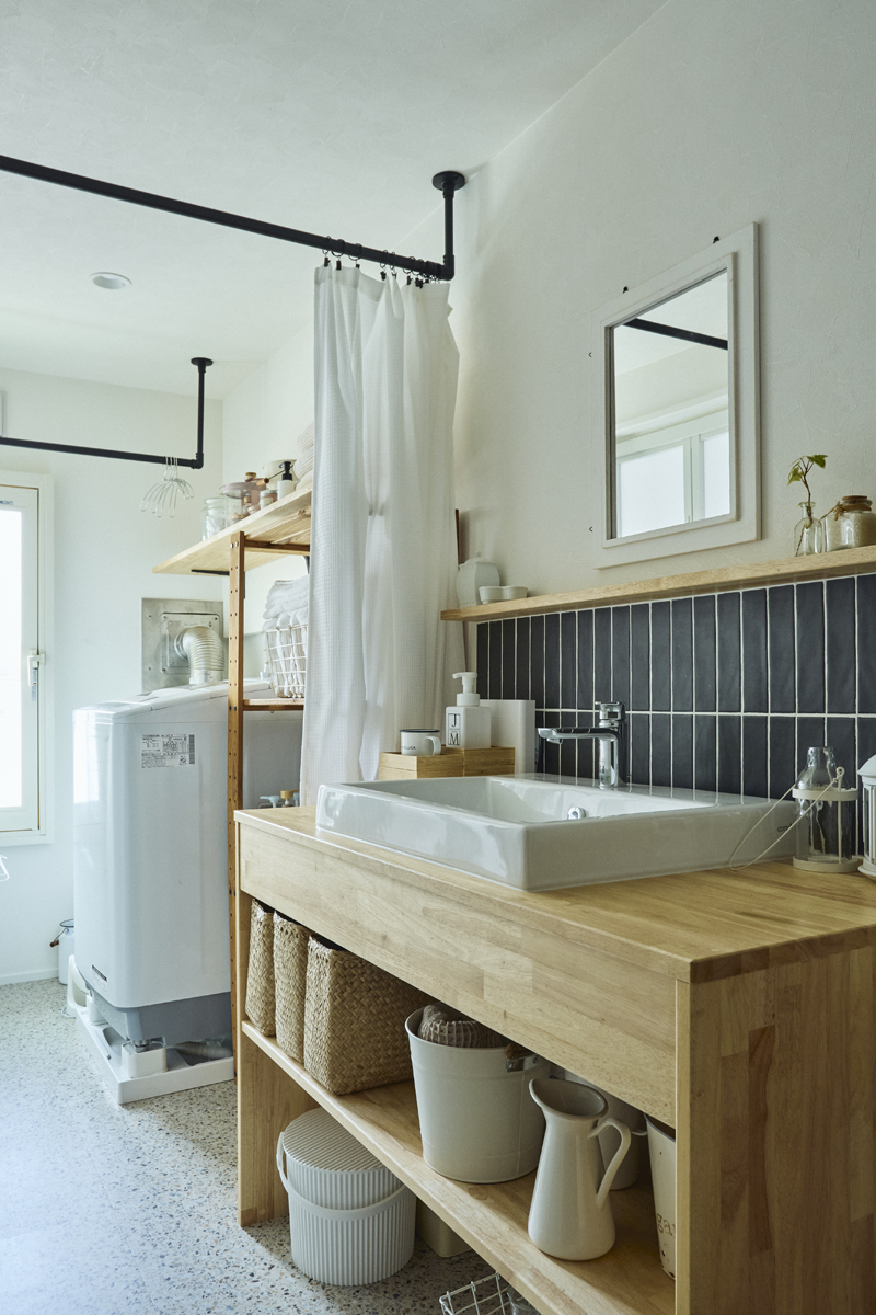 脱衣場と洗面はカーテンで仕切り、時間がかぶってしまったときでも対応できるように計画しました。