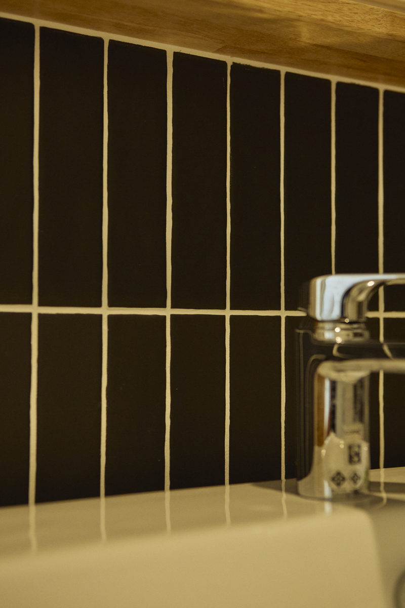 洗面のタイルには、華奢で若干の波打つようなデザインの黒いタイルを縦貼りにして貼り付けました。お施主様持ち寄りミラーとの相性も抜群です。