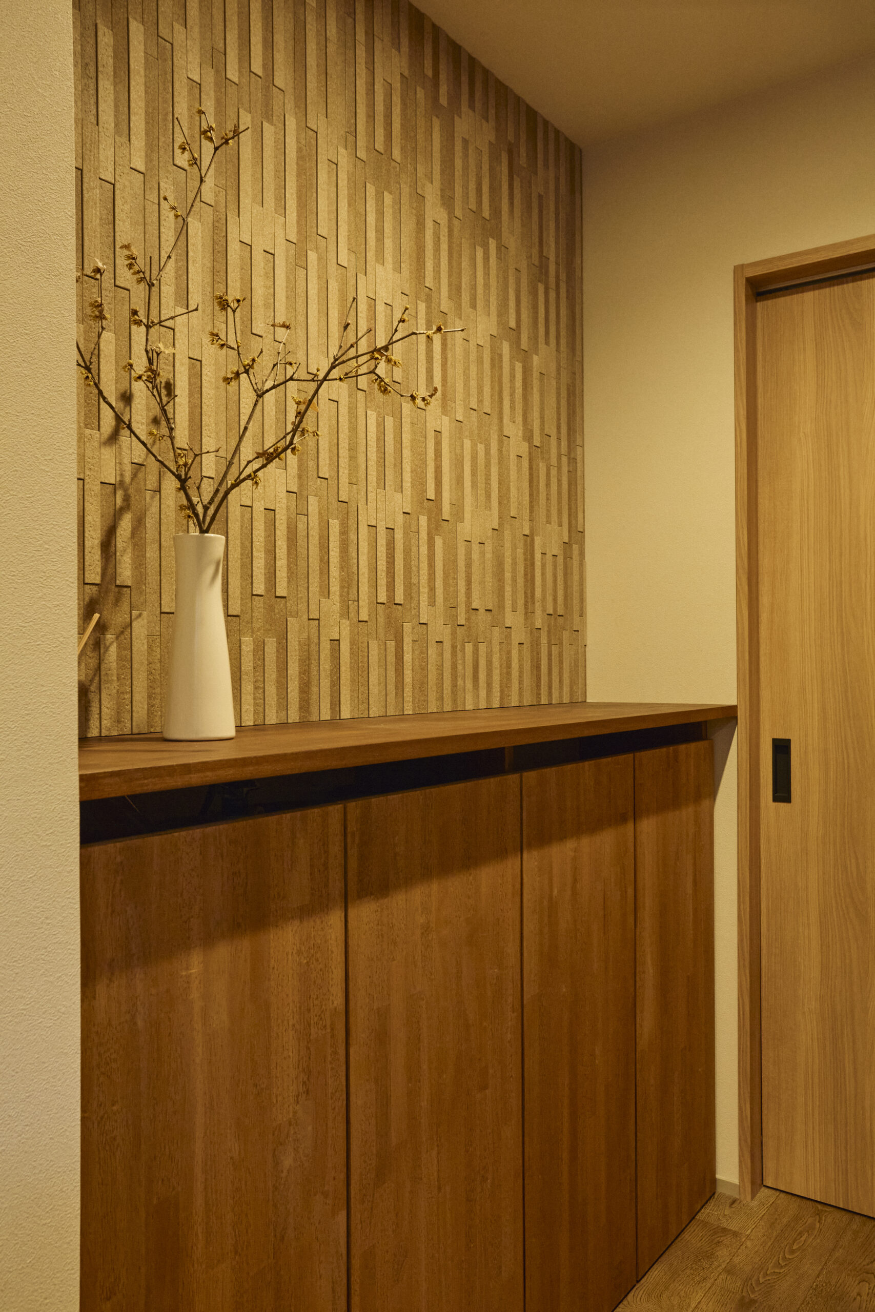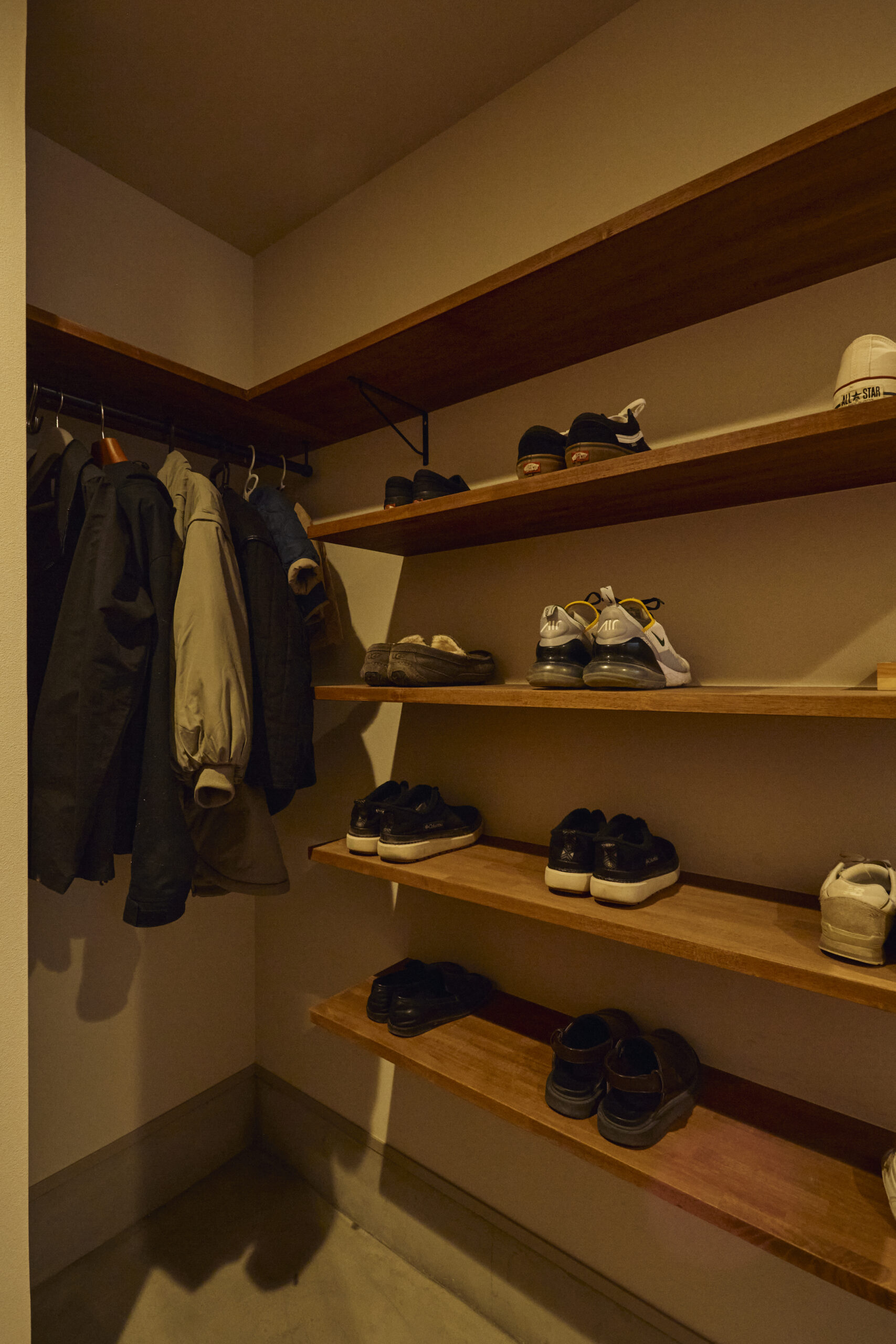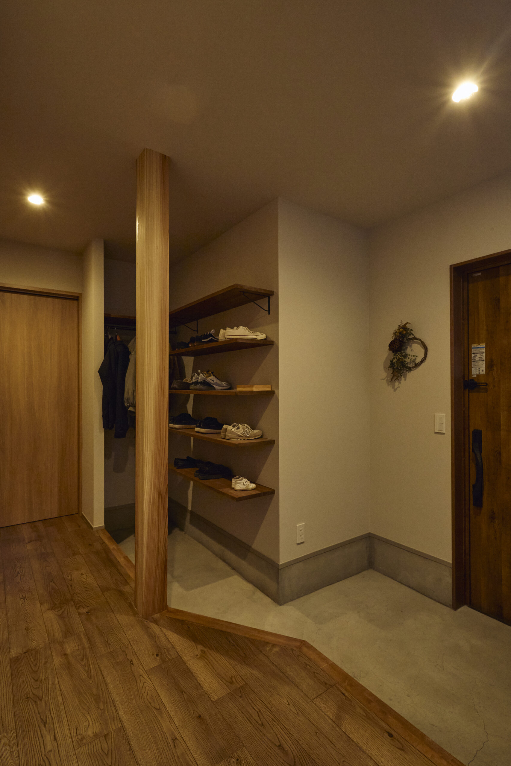 玄関は土間スペースを広げ、ゆったりとした開放感のある空間に。造作収納もたっぷり設けて、くつや外まわり用品もすっきり片付きます。