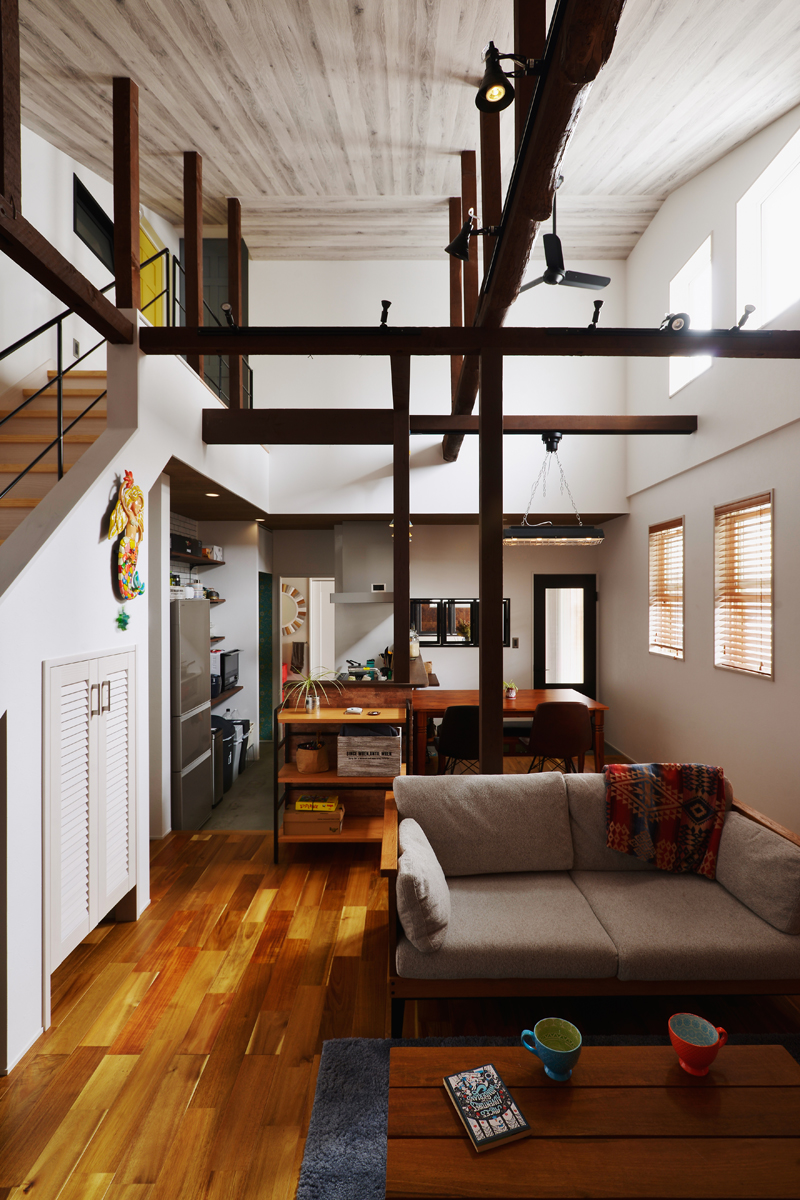 もともと平屋でしたが、天井を無くして解放感のある吹き抜けリビングに。玄関からキッチンを思い切って土間にし、玄関からそのままトイレへ行ける動線もこだわりです。