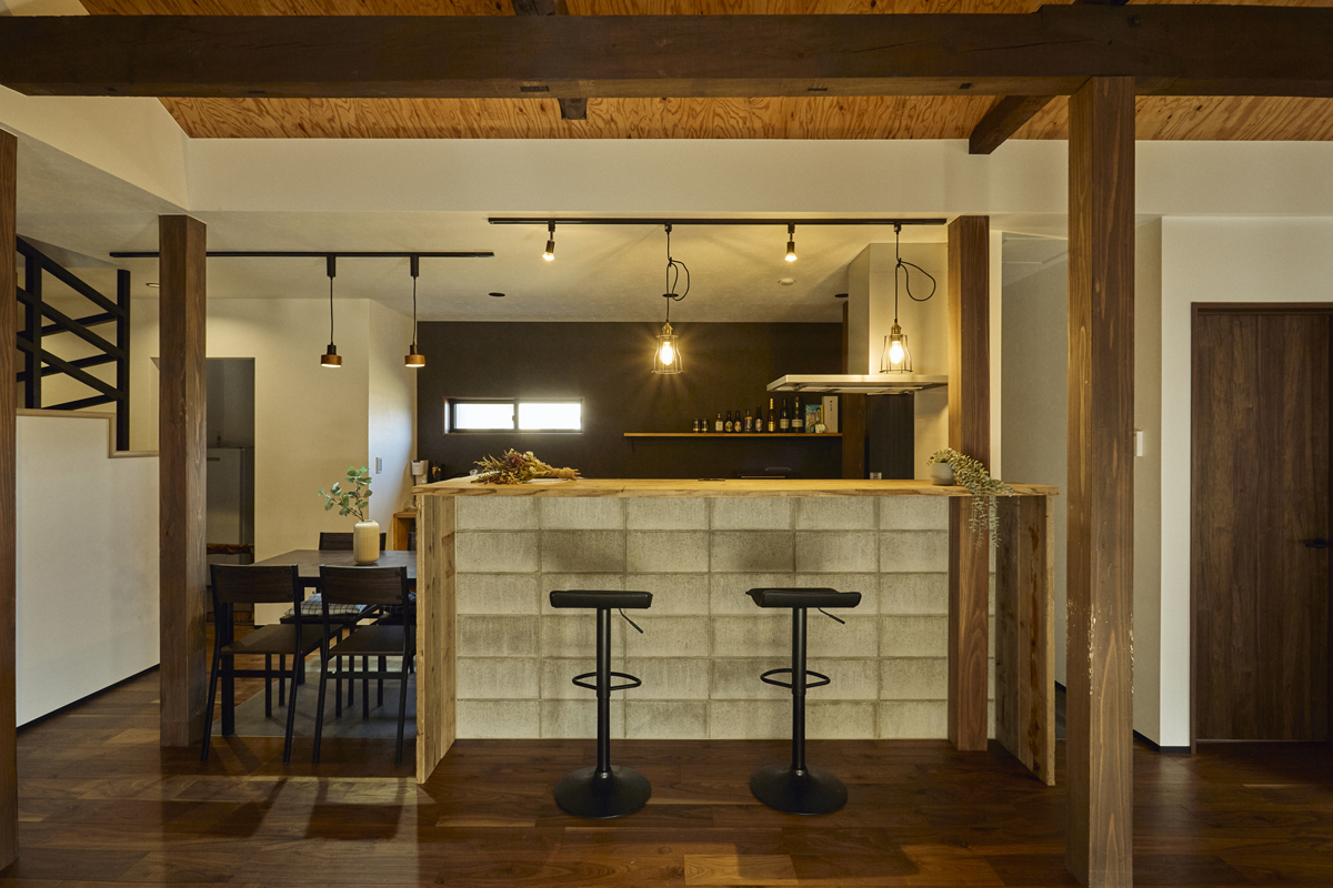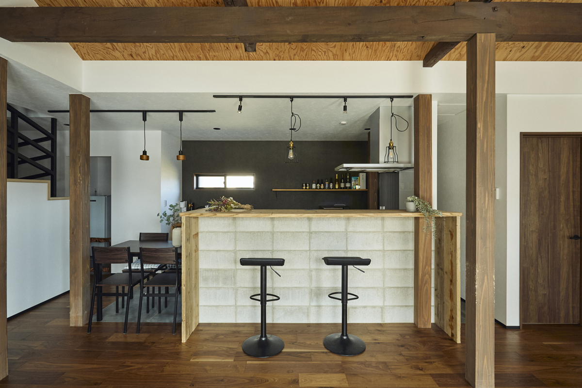 フローリングはウォルナットで暗めに、キッチン腰壁はコンクリートブロックを使用し、無骨なテイストでかっこよく。