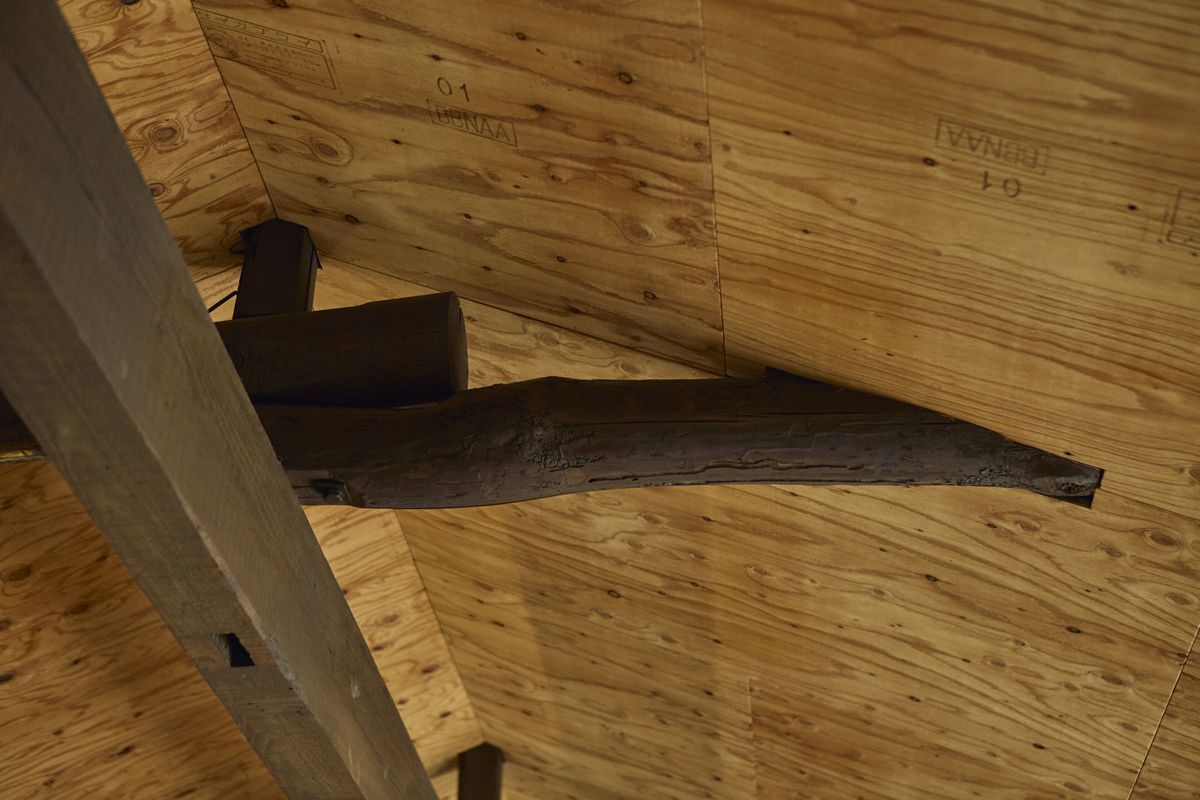 勾配天井にはラーチ合板という下地材を仕上げとして貼っています。