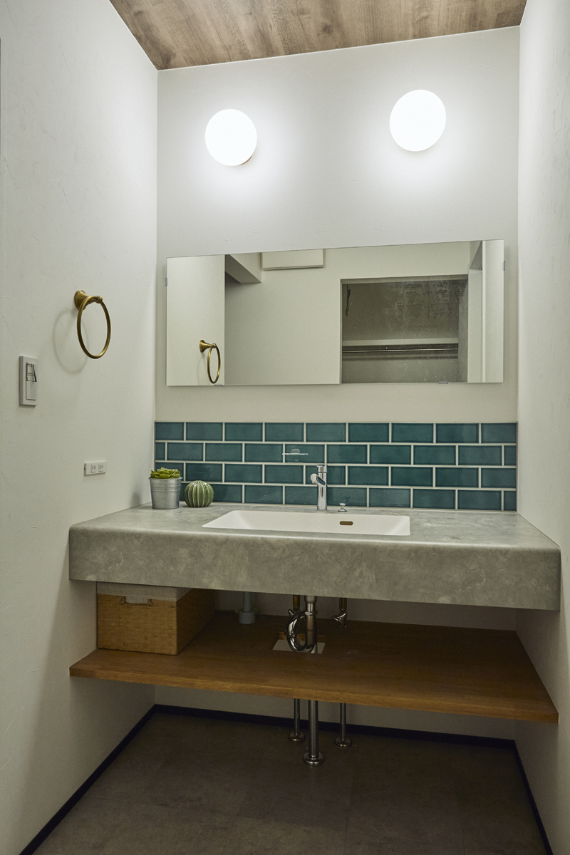 洗面とカウンタ―が一体となった商品でお掃除もしやすく、モルタル調のシートでおしゃれに仕上げています。緑のタイルが可愛らしい空間に。
